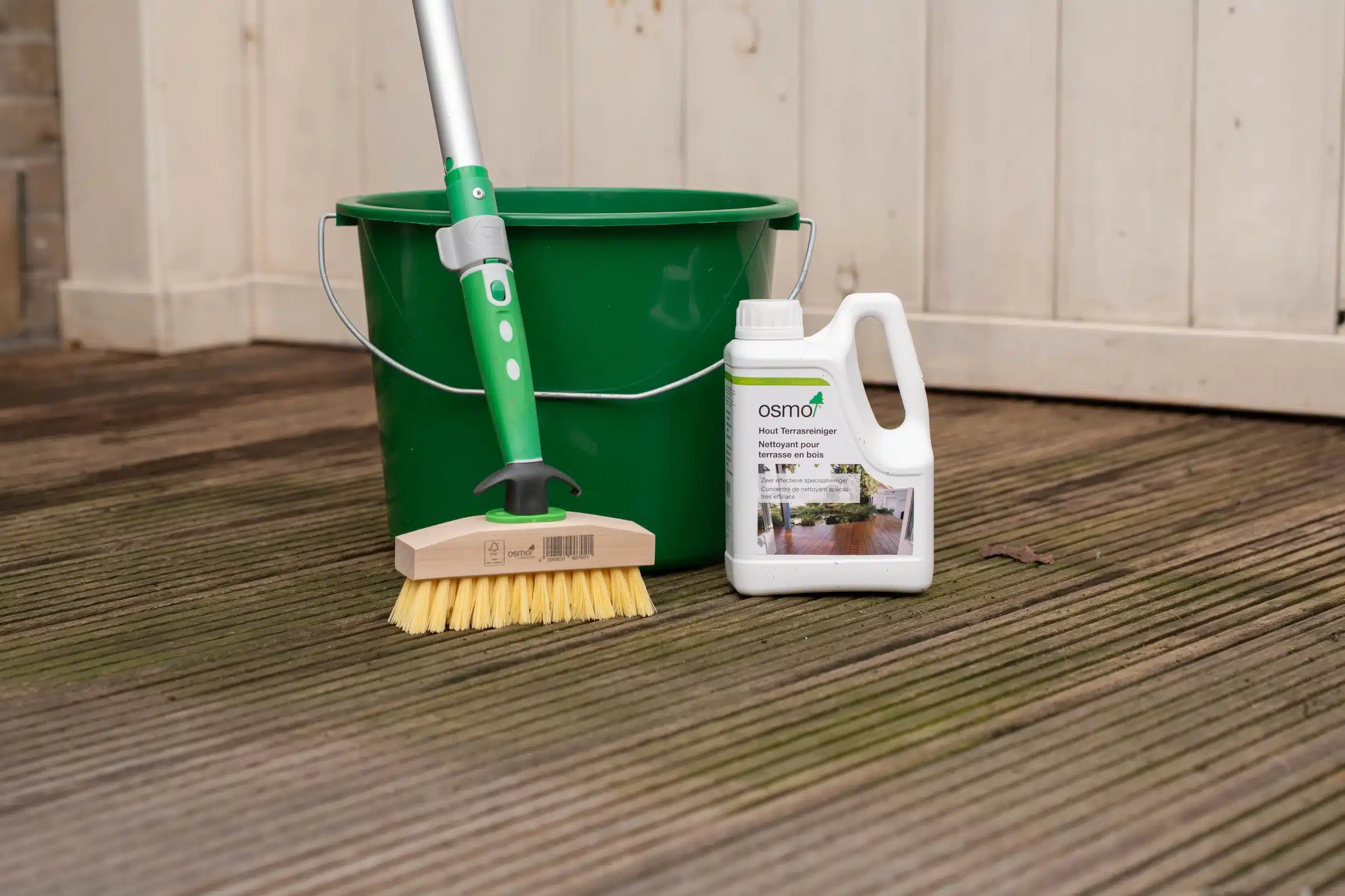 Groene aanslag op je terras ontstaat door vocht, schaduw en vuil dat zich ophoopt. Dit zorgt voor een gladde, onverzorgde uitstraling en kan het oppervlak aantasten. Met Osmo Terrasreiniger verwijder je groene aanslag eenvoudig en grondig, zodat je terras er weer schoon en fris uitziet.