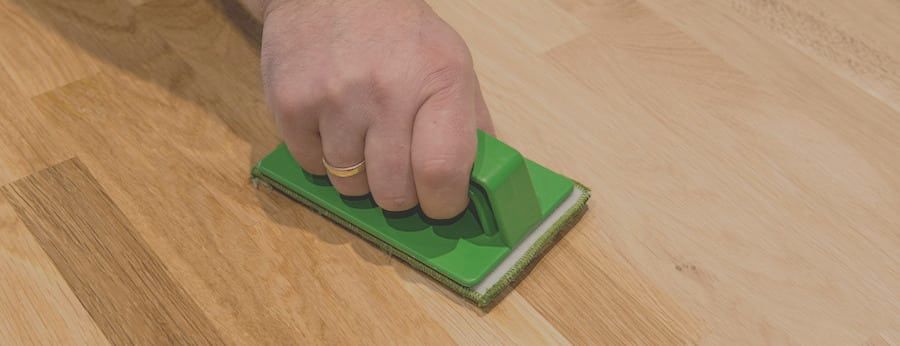 - Breng met de Osmo Microvezelroller een dunne laag aan op het hout. Doe dit met hetzelfde product waar de laatste laag mee is behandeld, bijvoorbeeld de Hardwax-Olie 3065 Semi-mat. Wanneer het beschadigde oppervlak alleen met korrel 120 is geschuurd is het advies om dit met een vezelvrije katoenen doek aan te brengen. Hiermee brengt u minder product aan op het oppervlak. Poets deze laag vervolgens droog met een andere droge vezelvrije doek.