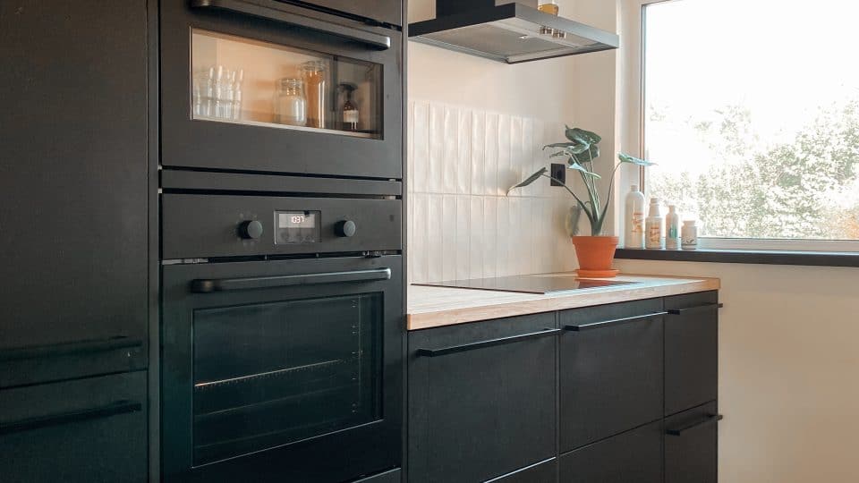 De fronten van deze prachtige keuken zijn gemaakt van zwart MDF HD Kleur. Deze gave zwarte kleur creëert een echte industriële look. De fronten van de keuken zijn behandeld met de Osmo Hardwax-Olie Original kleurloos. De kleurloze variant van de Hardwax-Olie zorgt voor een wetlook. Dit betekent dat de kleur van het MDF verdiept wordt.