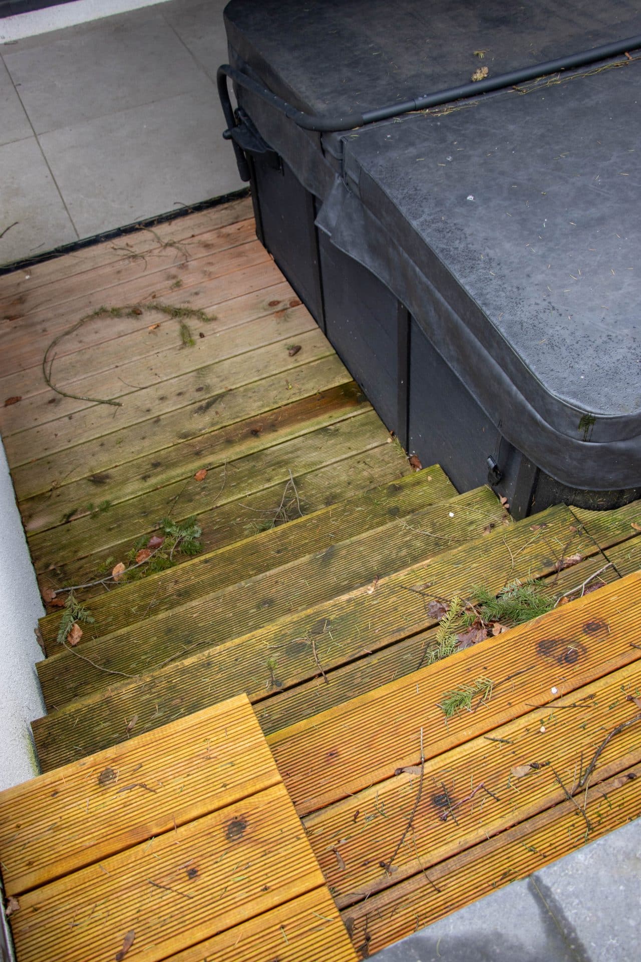 - Houd je terras vrij van bladeren en vuil om vochtophoping te voorkomen.