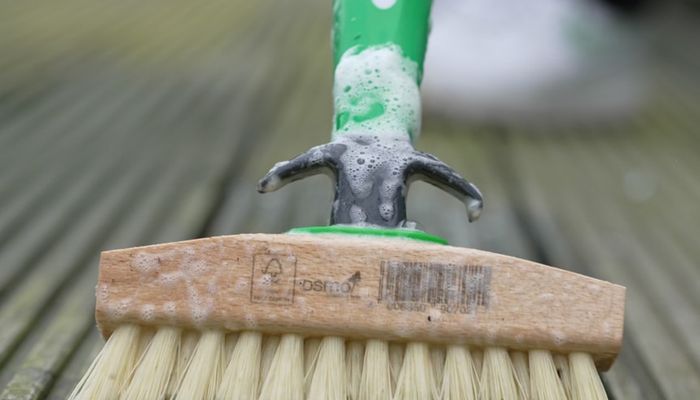 Gebruik een harde borstel om het oppervlak grondig te schrobben. Besteed extra aandacht aan hardnekkige plekken en groene vlekken. Bij zware vervuiling kun je de behandeling herhalen.